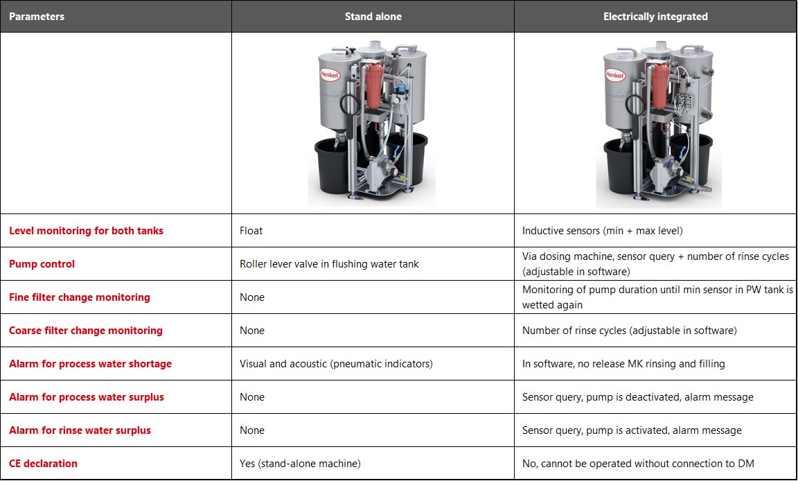 The visual and acoustic indicators on the frame of the rinse water recycling system signal when there is too little water in the process water tank. The visual signal turns red and the acoustic indicator emits a whistling sound (the volume can be adjusted). In the two electrically integrated versions, a warning message is displayed on the HMI of the dosing machine.